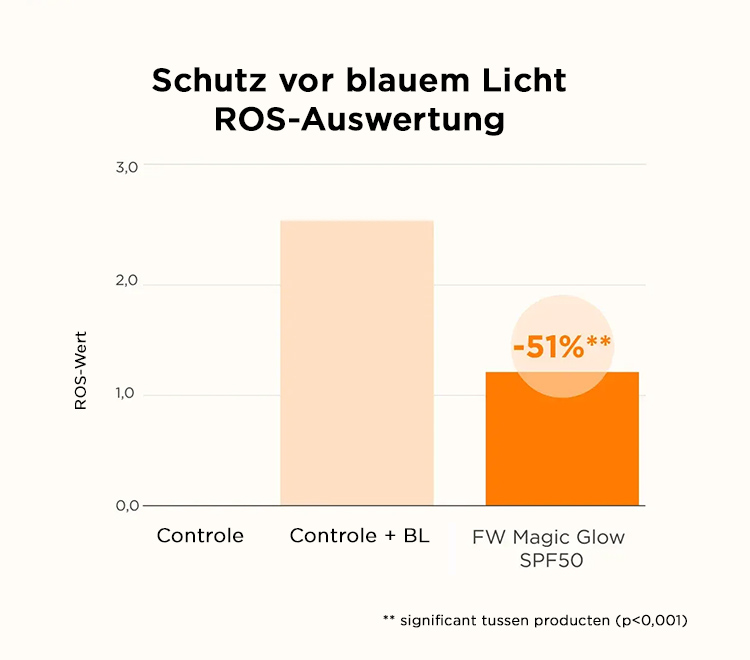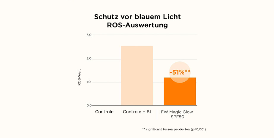 FusionWater MAGIC GLOW LSF 50 hat nachweislich den durch blaues Licht verursachten oxidativen Stress signifikant verringert – mit einer Reduktion von 51 % bei der übermäßigen Bildung reaktiver Sauerstoffspezies (ROS)².