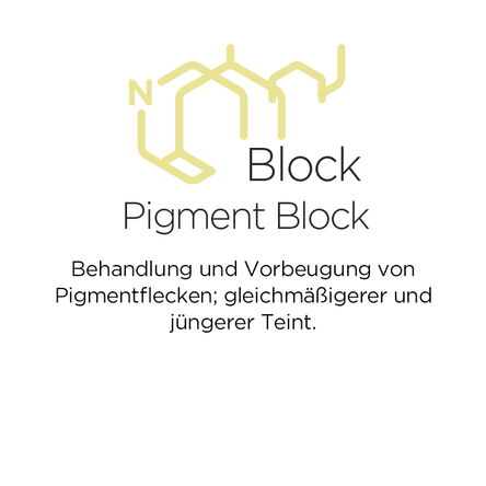 Pigment Block: Kombination aus 4-n-Butylresorcin, Hydroxy-Phenoxypropionsäure und Niacinamid, mit depigmentierenden Eigenschaften.