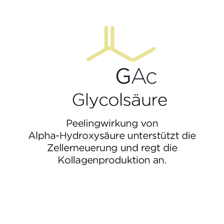 Glykolsäure: Peelingwirkung von Alpha-Hydroxysäure unterstützt die Zellerneuerung und regt die Kollagenproduktion an.