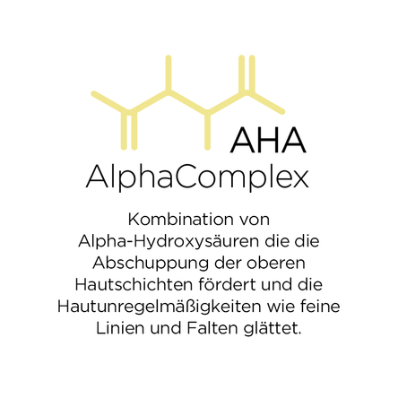 Eine Kombination aus Alphahydroxysäuren - Glykol-, Wein- und Apfelsäure -, die die Exfoliation der oberflächlichen Hautzellen anregt, um oberflächliche Unebenheiten, feine Linien und Falten zu mildern.