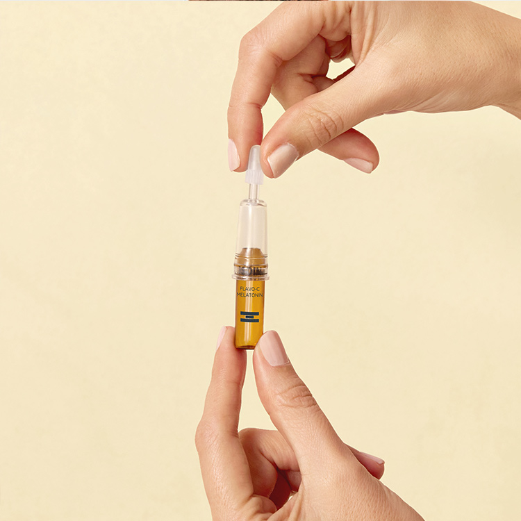 Die reparierende Wirkung von Flavo-C® Melatonin fördert die antioxidativen Abwehrkräfte der Haut während der Nacht, damit du mit einem strahlenden Teint aufwachst.