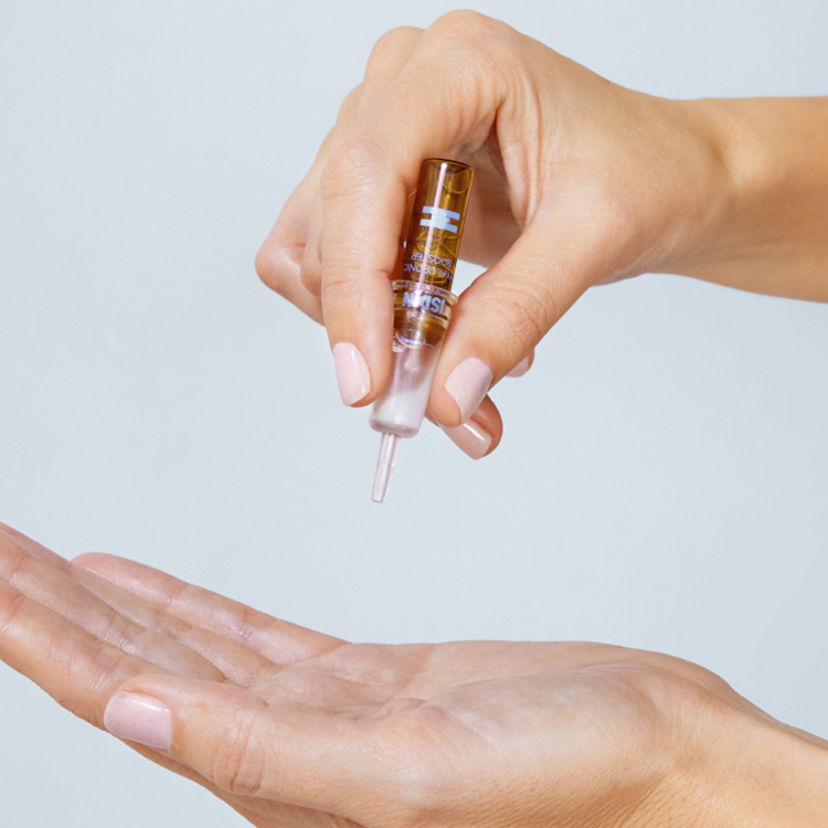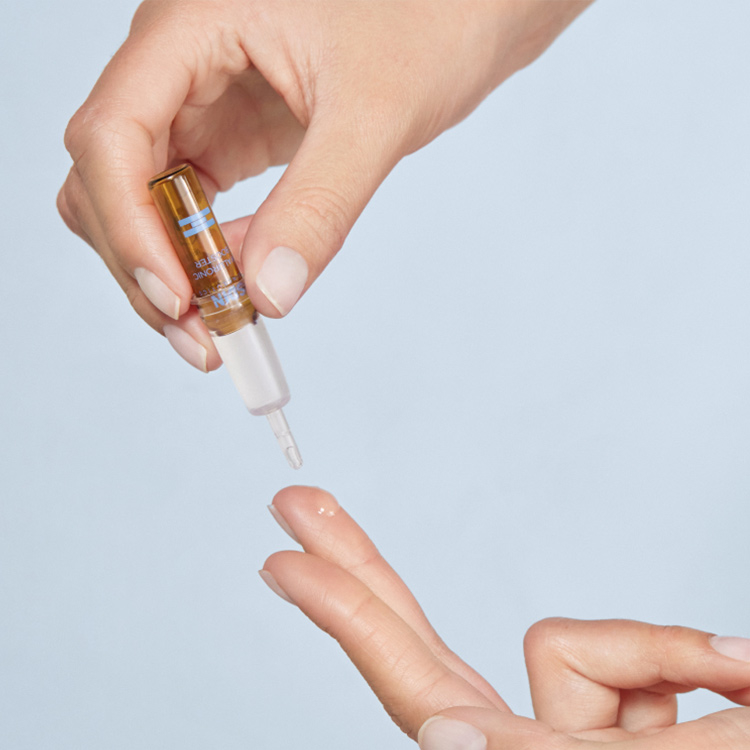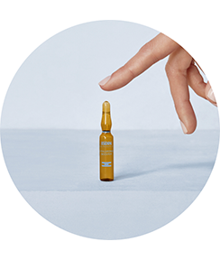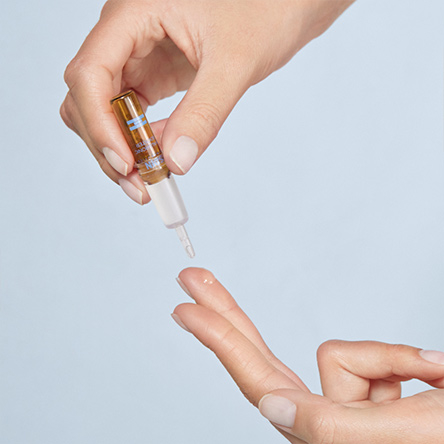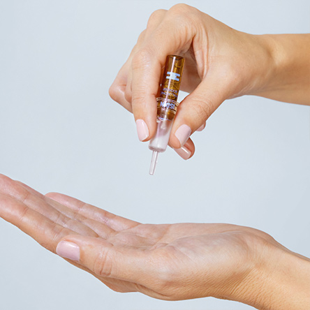 Aplica un tercio de la ampolla en la mano y masajea sobre la piel limpia y seca del rostro, cuello y escote, evitando el contorno de los ojos.
