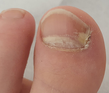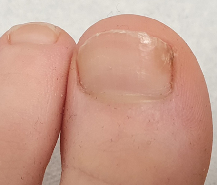 *Proximale subunguale Onycho-mykose bei einer jungen Frau vor und nach Therapie mit Pirocton-Olamin und Mastix. (MicoXpert). Erreger: T. rubrum. - source: Tietz H-J. Die Mykologie – ein ... Kompendium Dermatologie 2025; 1–5 | © 2025. Thieme. All rights reserved