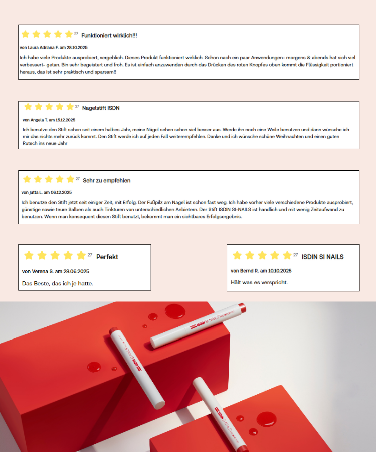 Für positive ISDIN SI-NAILS MicoXpert Erfahrungen sollte die Anwendung mindestens 3 Monate betragen. Je nach Nagelwachstum und Schweregrad kann die Nagelpilz Behandlung 6 bis 12 Monate dauern, um optimale Ergebnisse zu erzielen.
