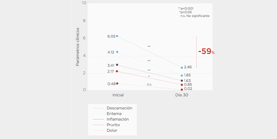 Die Verwendung von Ureadin® Ultra30 Exfolierende Creme reduziert die Schuppenbildung um 59 %. Außerdem reduziert sie bei Probanden mit hyperkeratotischer Haut¹ deutlich Rötungen, Hautdicke und Wasserverlust.