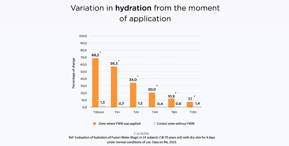 more quickly. Using Fusion Water MAGIC SPF 50 supports a significant increase in the skin’s hydration.