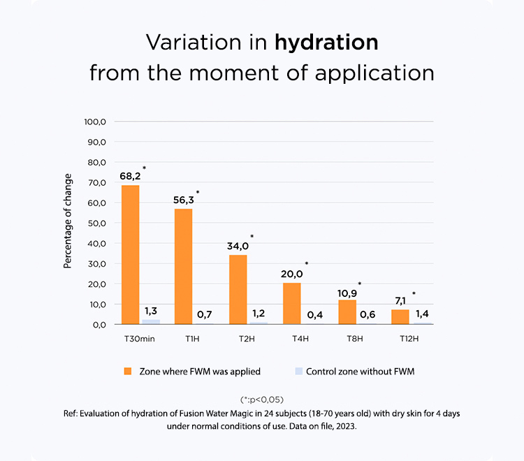 ¹ Evaluation of hydration and TEWL of Fusion Water Magic in 24 subjects (18-70 years old) with dry skin for 4 days under normal conditions of use. Data on file, 2023.