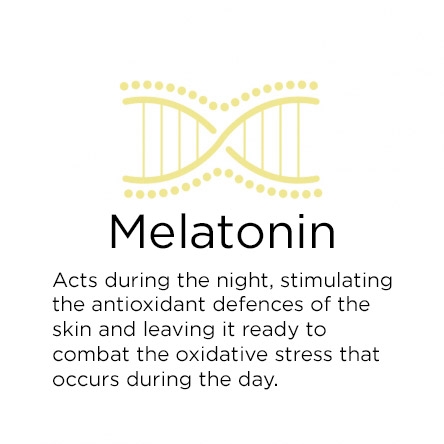 Melatonin: Acts during the night, stimulating the antioxidant defences of the skin and leaving it ready to combat the oxidative stress that occurs during the day.