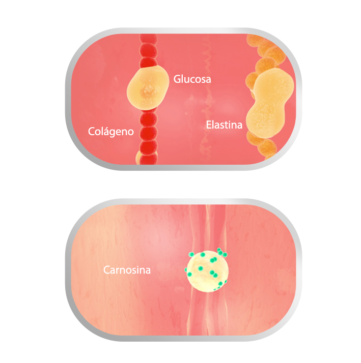 La carnosina retrasa el proceso de formación de los productos finales de la glicación avanzada, mantiene la funcionalidad del colágeno y la elastina y devuelve a la piel elasticidad y firmeza.
