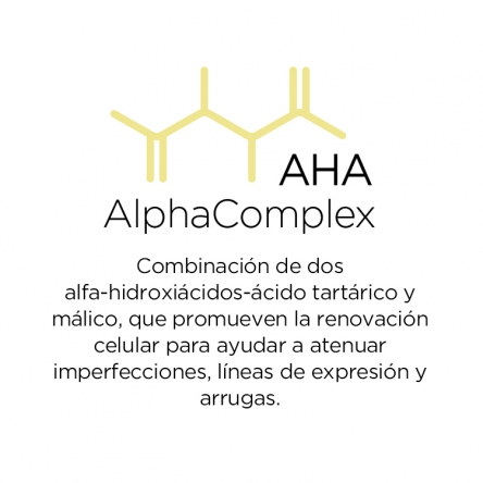 Combinación de ácidos alfa-hidroxiácidos -glicólico, tartárico y málico- que estimula la exfoliación de las células superficiales de la piel para ayudar a atenuar las imperfecciones de la superficie, las líneas finas y las arrugas. Estimula la producción de colágeno ayudando a reducir los signos del fotoenvejecimiento a la vez que proporciona hidratación profunda e inmediata.
