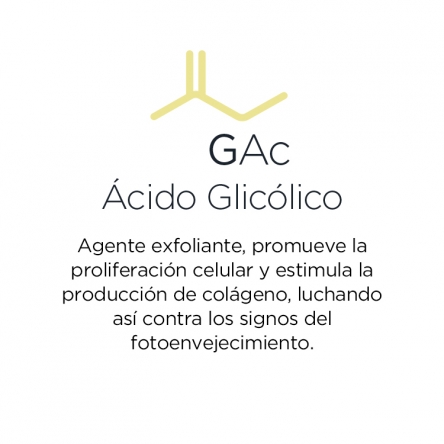 Ácido Glicólico: agente exfoliante, ayuda a promover la proliferación celular y a estimular la producción de colágeno.