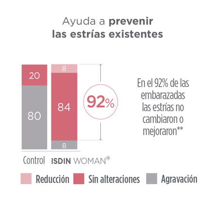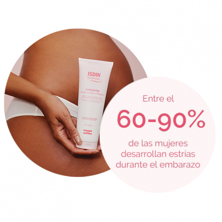 A lo largo de tu vida, tu piel experimenta cambios. El embarazo, la adolescencia, la práctica de deporte o los cambios de peso pueden provocar la aparición de estrías. Potencia la elasticidad de la piel y ayuda a prevenir la aparición de estrías con ISDIN Woman Antiestrías. Eficacia demostrada clínicamente. Tras su uso, el 94% de las embarazadas no presentaron nuevas estrías*. Testado dermatológica y ginecológicamente.