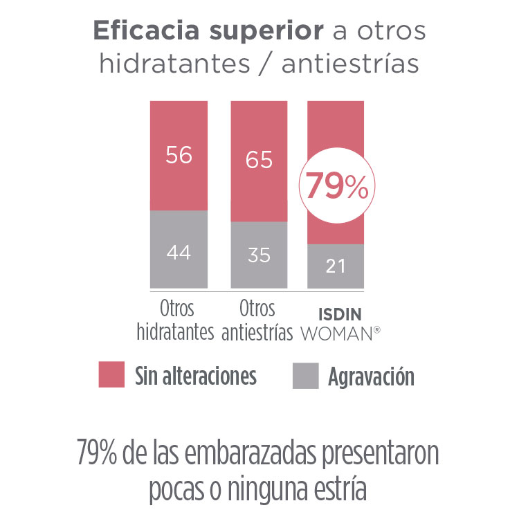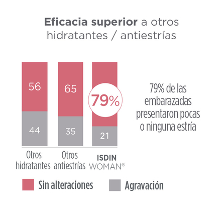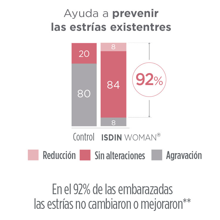 * Estudio sobre la eficacia ISDIN Woman Antiestrías para prevenir su aparición durante el embarazo durante unos 8 meses de uso en 38 mujeres mayores de 18 años sin presencia de estrías previas. Data on file, 2011