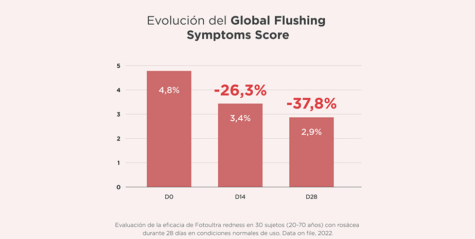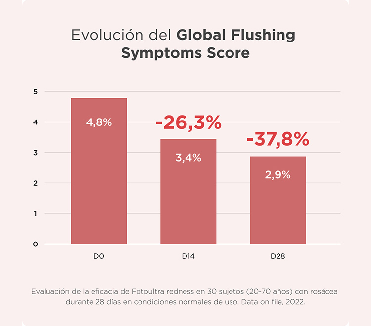 Los resultados de la evaluación de Redness SPF 50 muestran una disminución estadísticamente significativa en la puntuación del Global Flushing Symptoms Score, con una reducción de los signos del enrojecimiento del 26,3% después de 14 días de uso y del 37,8% después de 28 días de uso.