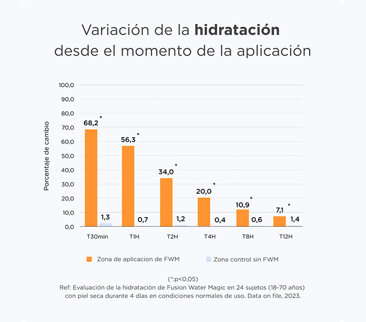 Fusion Water MAGIC SPF 50 ha demostrado un incremento del 68% en la hidratación de la piel 30 minutos después de su aplicación, manteniéndose 1 hora después en un 56% y en un 7% tras 12 horas.
