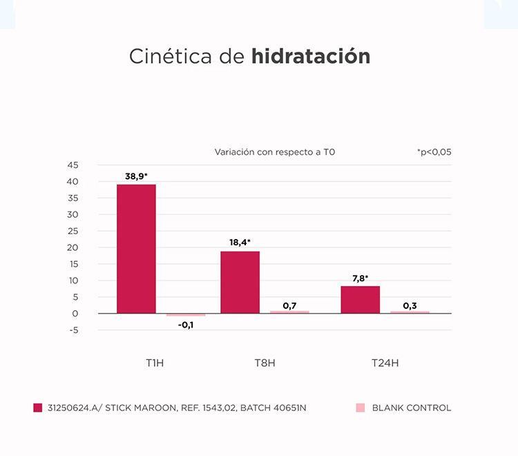 ² Evaluación de la cinética de hidratación de Isdin Reparador Labial Stick Granate en los antebrazos, en 24 sujetos de 18 a 70 años, durante 24 horas. Data on file, 2024. (*Estos resultados se aplican a las versiones Sin Color, Rojo y Rosa del Stick).