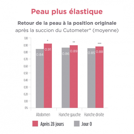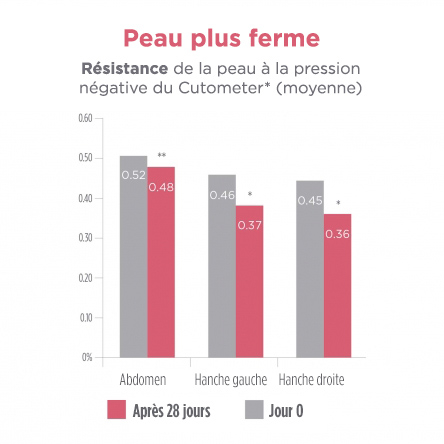 *Test réalisé sur 32 femmes post-partum avec des vergetures modérées pendant 4 semaines pour évaluer l'élasticité et la fermeté de leur peau à l'aide du Cutometer.