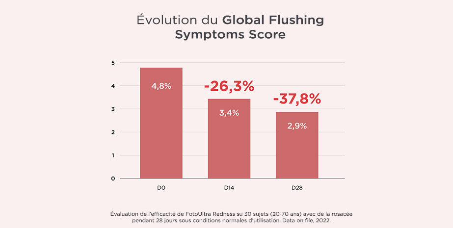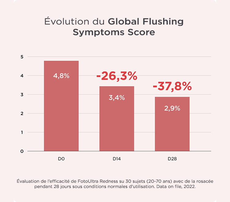 2 Évaluation de l’efficacité de FotoUltra Redness SPF 50 sur 30 sujets (20 - 70 ans) avec une rosacée légère ou modérée après 28 jours sous conditions normales d’utilisation. Data on file, 2023