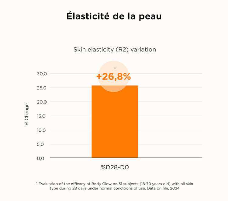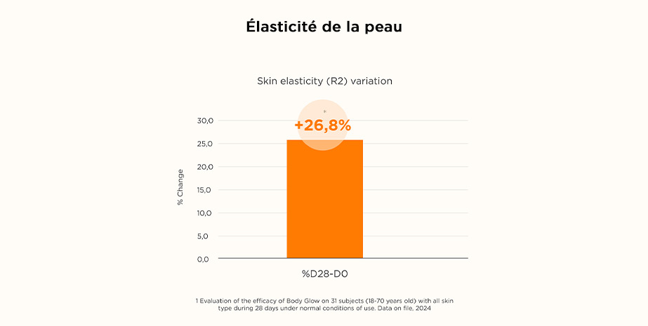 Body Glow SPF 30 améliore l'élasticité de la peau jusqu'à 26,8 % après 28 jours d'utilisation.