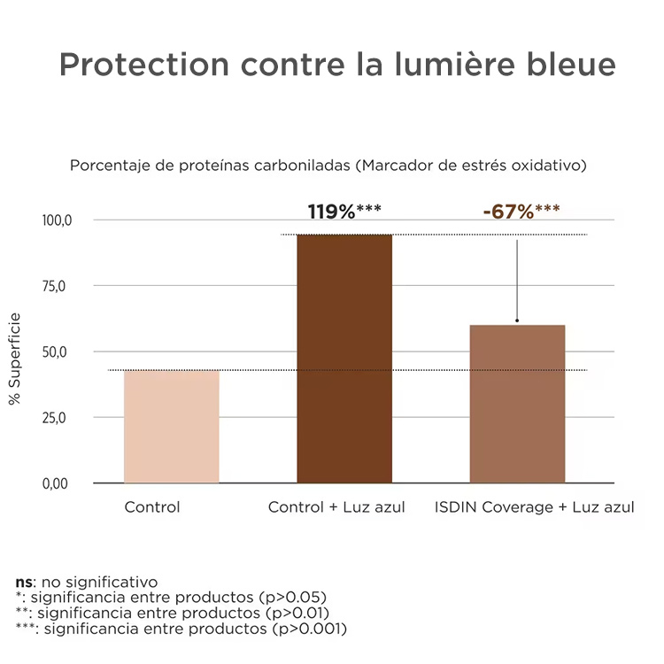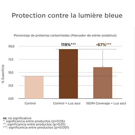 2. Évaluation ex vivo de l'efficacité protectrice d'ISDIN Coverage SPF 50+ contre les dommages induits par la lumière bleue sur des explants cutanés. Données archivées, 2025.
