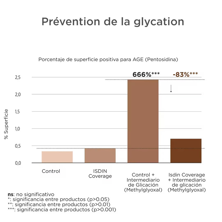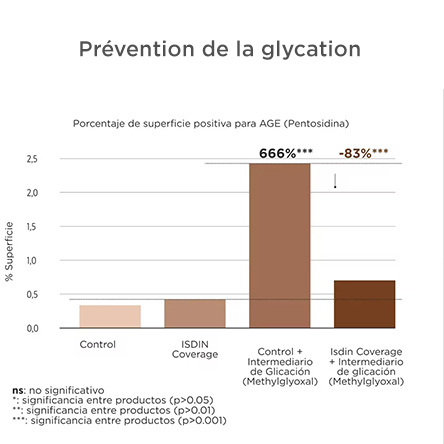 3. Évaluation ex vivo de l'effet préventif d'ISDIN Coverage SPF 50+ sur la formation de produits finaux de glycation avancée (AGE) sur des explants cutanés. Données archivées, 2025.
