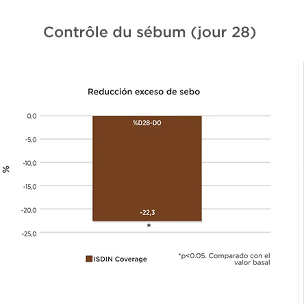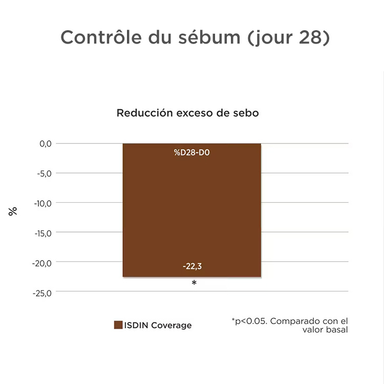 Coverage SPF 50+ réduit l'excès de sébum de la peau de 22,3% après 4 semaines d'application.⁵