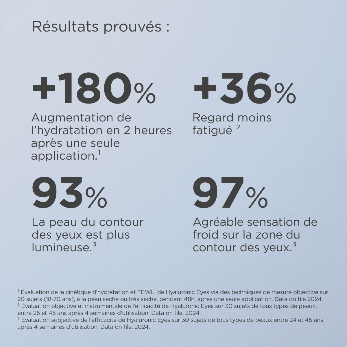 ² Évaluation objective et instrumentale de l’efficacité de Hyaluronic Eyes sur 30 sujets de tous types de peaux, entre 25 et 45 ans après 4 semaines d’utilisation. Data on file, 2024.