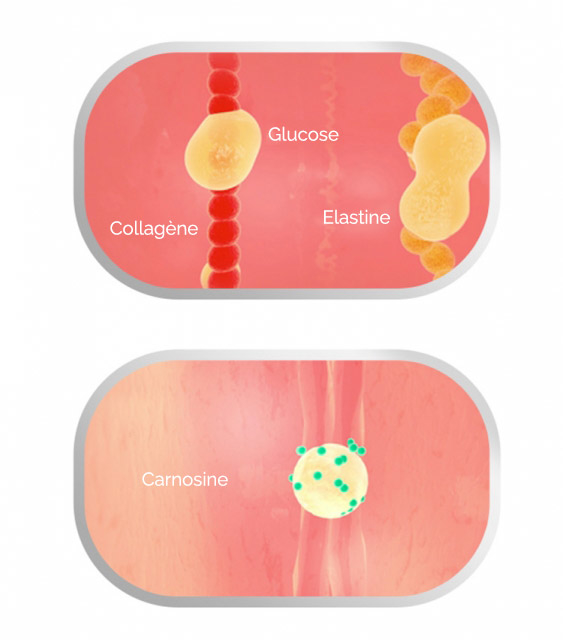 Retarde la formation des produits finaux de la glycation (A.G.E.) grâce à l’action de la carnosine.