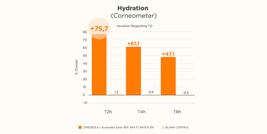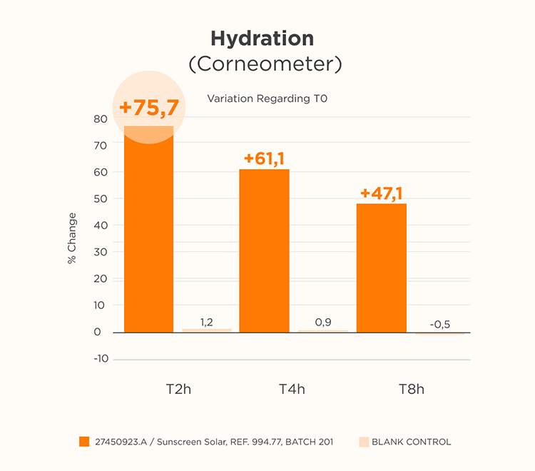 Solar Allergy Protect SPF 50+ aumenta l’idratazione della pelle del 75,7% un’ora dopo l’applicazione, mantenendosi al 61,1% dopo 4 ore, e del 47,1% a 8 ore.