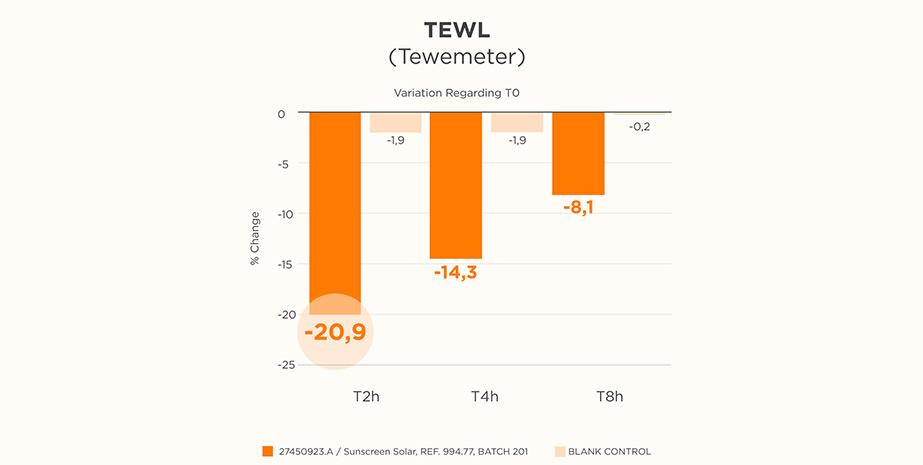 Solar Allergy Protect SPF 50+ aiuta a ridurre la perdita d’acqua nella pelle del 20,9% un’ora dopo l’applicazione, mantenendo la riduzione al 14,3% dopo 4 ore, e dell’8,1% a 8 ore.