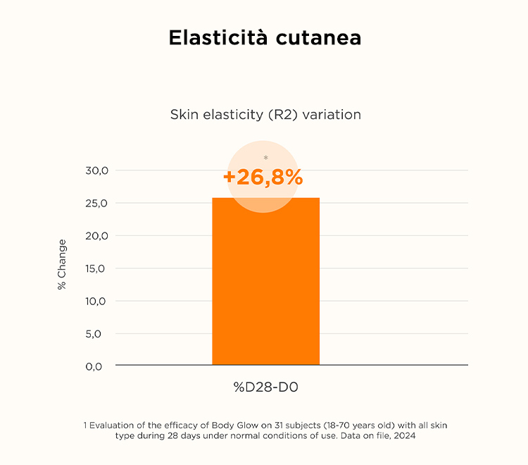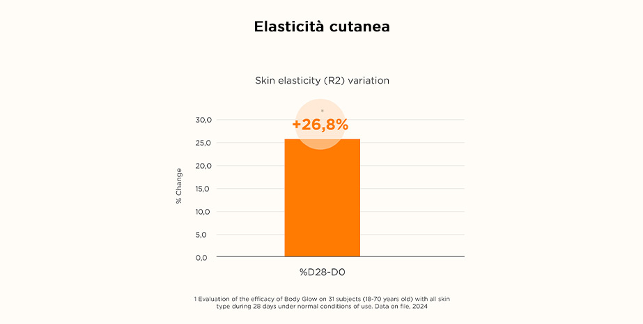 Body Glow SPF 30 migliora l'elasticità della pelle fino al 26,8% in più dopo 28 giorni di applicazione.