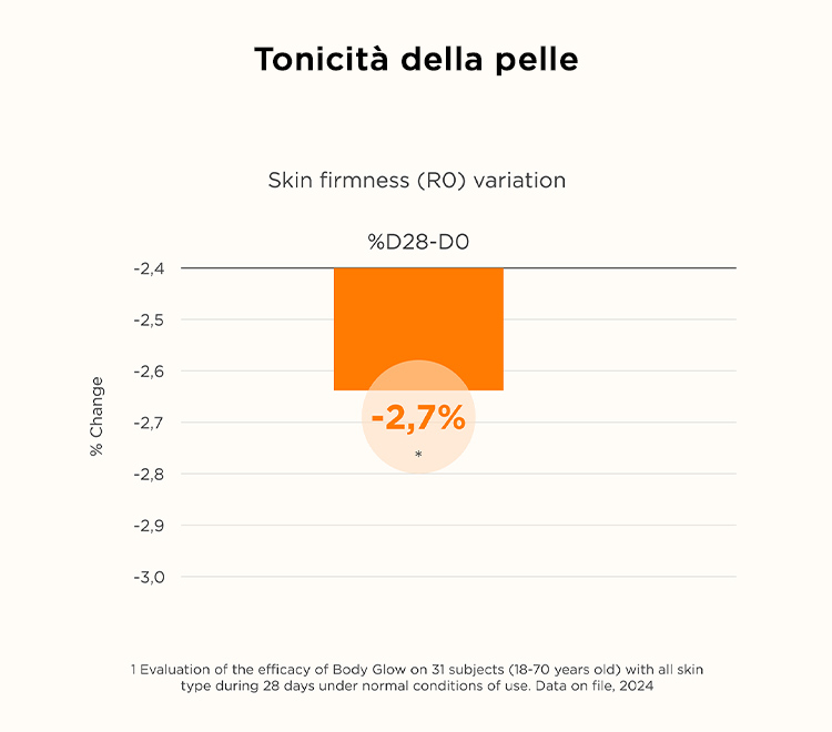 ² Valutazione dell’efficacia di Body Glow in 31 soggetti (18-70 anni) con tutte le tipologie di pelle, applicato per 28 giorni in normali condizioni di utilizzo. Data on file, 2024.