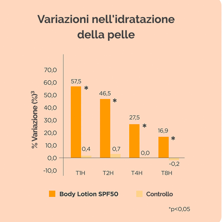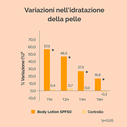 Body Lotion SPF 50 aumenta l'idratazione della pelle del 57,5% un'ora dopo l'applicazione, con benefici che permangono per 8 ore.