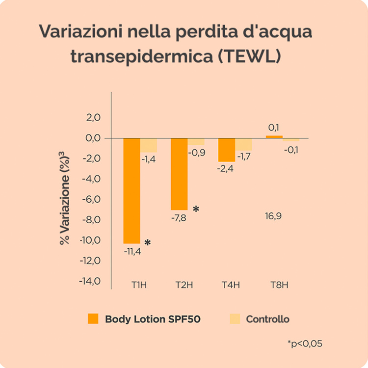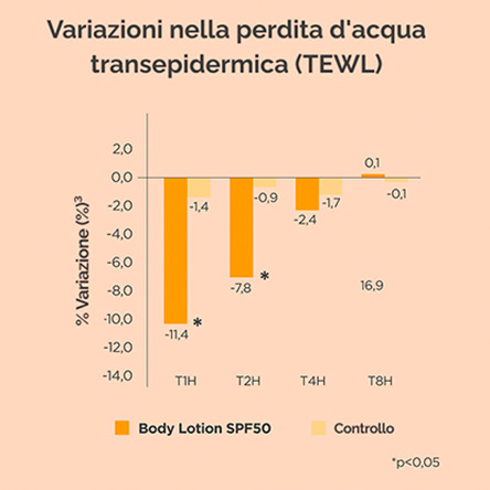 Body Lotion SPF 50 riduce la perdita di acqua transepidermica dell'11,4% dopo una sola applicazione, mantenendosi al 7,8% dopo due ore e rafforzando in modo significativo la funzione barriera della pelle.