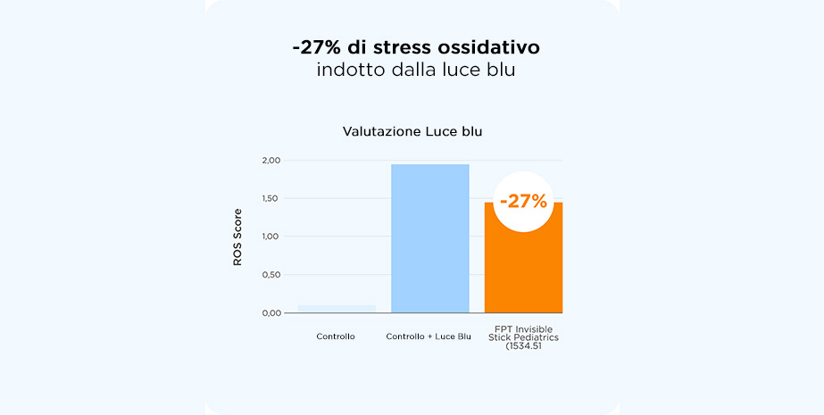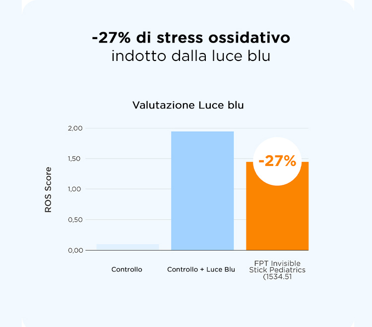 Pedriatrics Stick ha dimostrato di contrastare in modo efficace e significativa lo stress ossidativo prodotto dalla luce blu, riducendolo fino al 27%