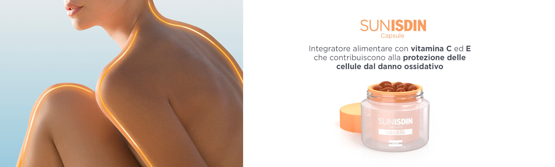 SunISDIN è un integratore alimentare con vitamina C ed E che contribuiscono alla protezione delle cellule dallo stress ossidativo.