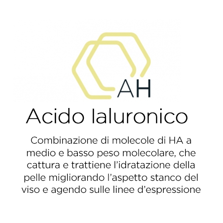 Combinazione di due molecole di acido ialuronico che aiuta la pelle a recuperare i naturali livelli di idratazione per una pelle radiosa. Inoltre, contiene un peptide con proprietà calmanti che riduce la sensazione di disidratazione.