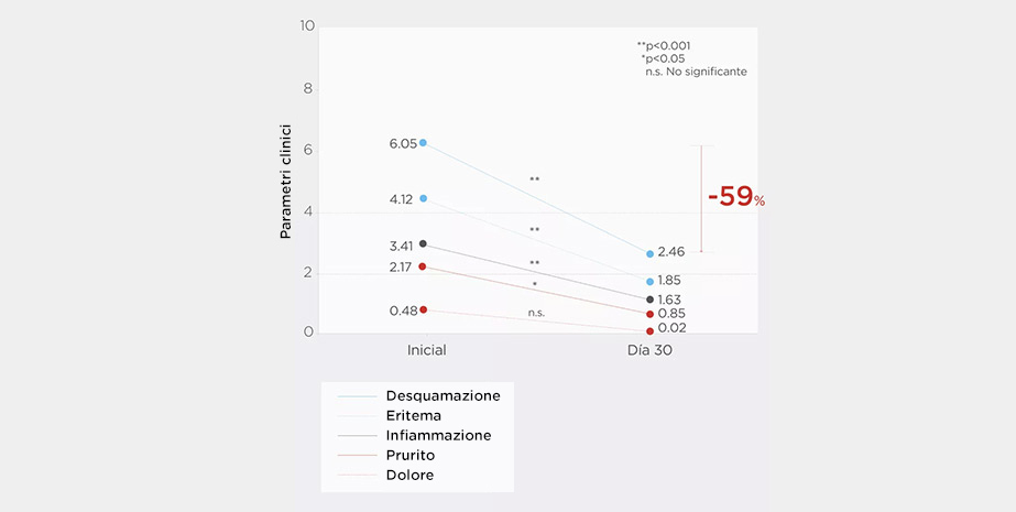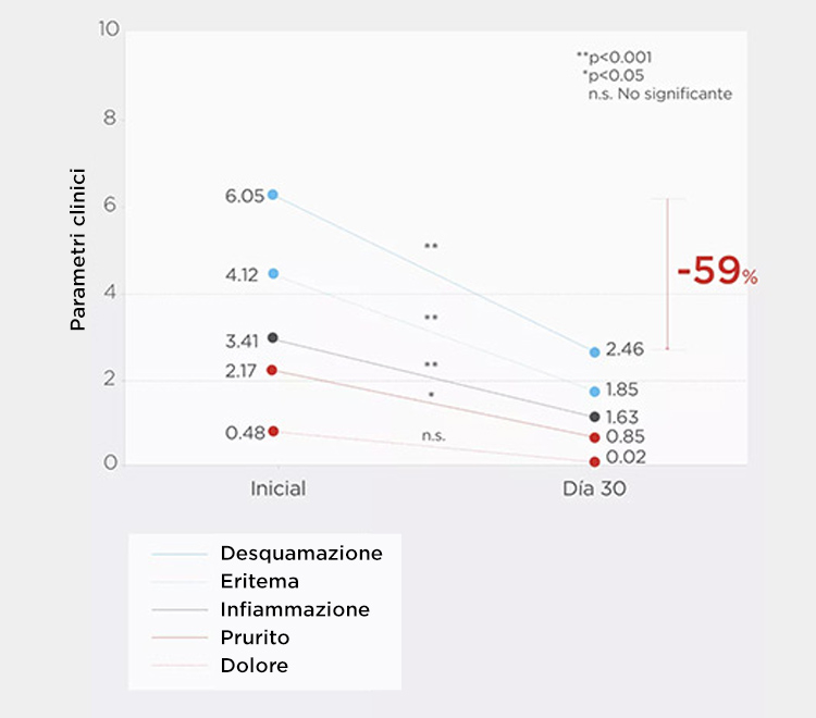 L'uso di Ureadin Ultra30 Crema Esfoliante riduce la desquamazione del 59%. Inoltre, riduce significativamente l'eritema, lo spessore della pelle e la perdita d'acqua nei volontari con ipercheratosi.¹