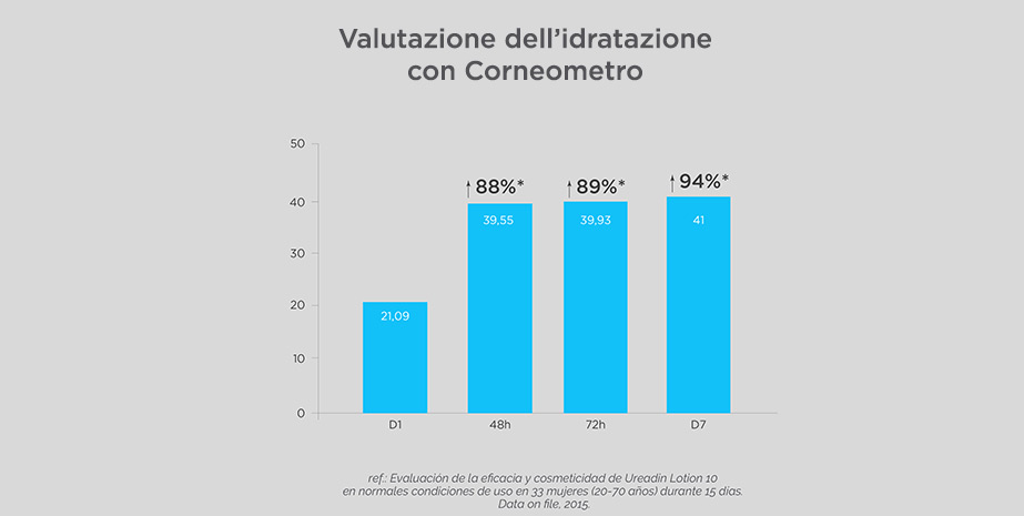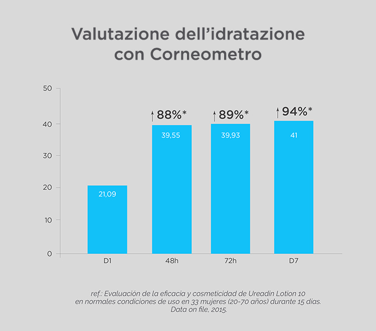 L'uso quotidiano di Ureadin® Lotion10 ha migliorato l'idratazione della pelle fin dal primo giorno di applicazione: dell'88% dopo 48 ore, dell'89% dopo 72 ore e del 94% dopo 7 giorni.¹