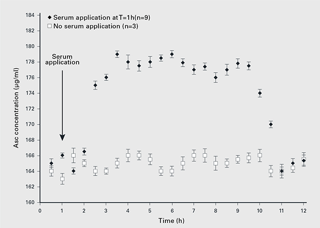 Na het aanbrengen van het Flavo-C-serum stijgt het vitamine C-gehalte tot 8,5% hoger dan normaal.