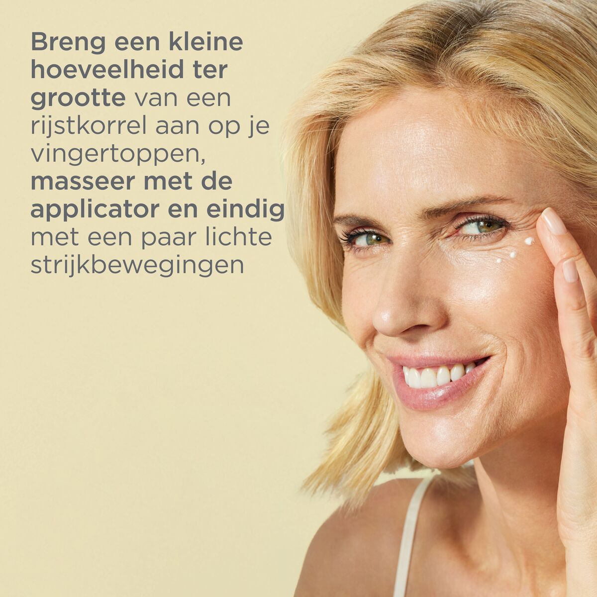Het product dagelijks aanbrengen door het zachtjes uit te smeren en met de vingertoppen te tappen op de wallen en donkere kringen totdat het volledig is opgenomen.