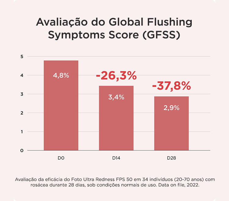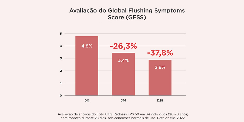 Os resultados da avaliação de Foto Ultra ISDIN Redness FPS 50 mostram uma diminuição estatisticamente significativa na pontuação do Global Flushing Symptoms Score, com uma redução dos sinais de vermelhidão de 26,3% após 14 dias de uso e de 37,8% após 28 dias de uso.