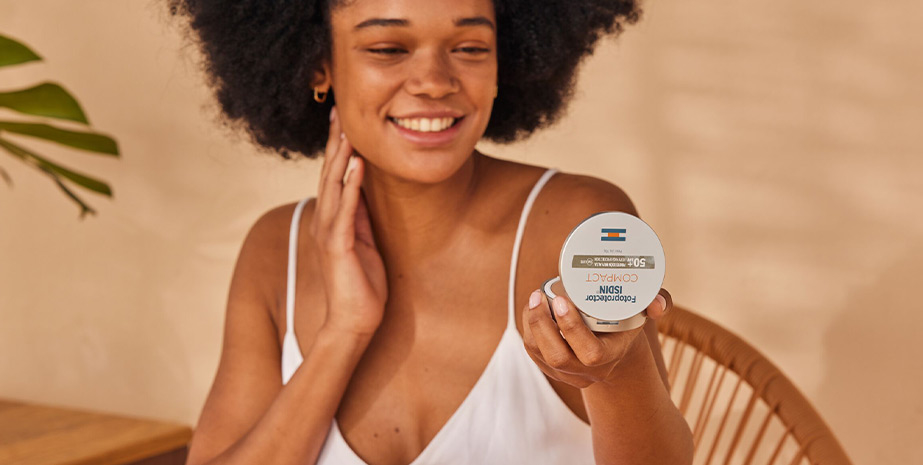 Compact Bronze FPS 50+ uniformiza a pele, com um tom natural que disfarça as imperfeições.