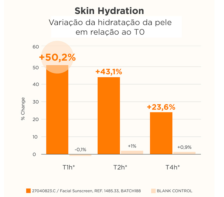 Fusion Water MAGIC GLOW FPS 30 aumenta a hidratação da pele em 30,2% uma hora após a aplicação, mantendo o aumento em 43,1% após duas horas e 23,6% após quatro horas².