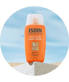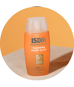 ISDIN Fusion Water Magic Glow é um protetor solar facial para o uso diário que promove um efeito Glow instantâneo na pele, graças ao ativo Golden Glow. Com FPS 30, promove alta proteção UV, auxilia na proteção contra a luz azul, possui textura ultraleve, hidrata a pele e é absorvido imediatamente sem deixar resíduo oleoso. Fusion Water Magic Glow deixa a pele iluminada e com aspecto saudável, controla a oleosidade da pele, não irrita os olhos e também possui ação antioxidante graças à Vitamina E.
