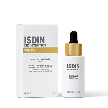 Isdinceutics Salicylic Renewal é um sérum facial formulado especialmente para peles mistas ou oleosas que renova, matifica e unifica o tom da pele graças às suas ações anti-imperfeições, antissinais e oil control. Sua fórmula combate os sinais da idade, as imperfeições da pele, reduz o excesso de oleosidade, melhora a textura da pele, reduz os poros visíveis e cravos. Ele promove 6h de controle de oleosidade com uma única aplicação³ . Com resultados visíveis de redução das rugas e oleosidade em apenas 2 semanas¹, sua formulação contém o complexo Acid Renewal com 12% de ácidos em um blend único que promove +45% de efeito peeling auxiliando na renovação da pele². Dentre os principais ingredientes da sua fórmula estão presentes o ácido salicílico, ácido glicólico, ácido hialurônico e a gluconolactona.