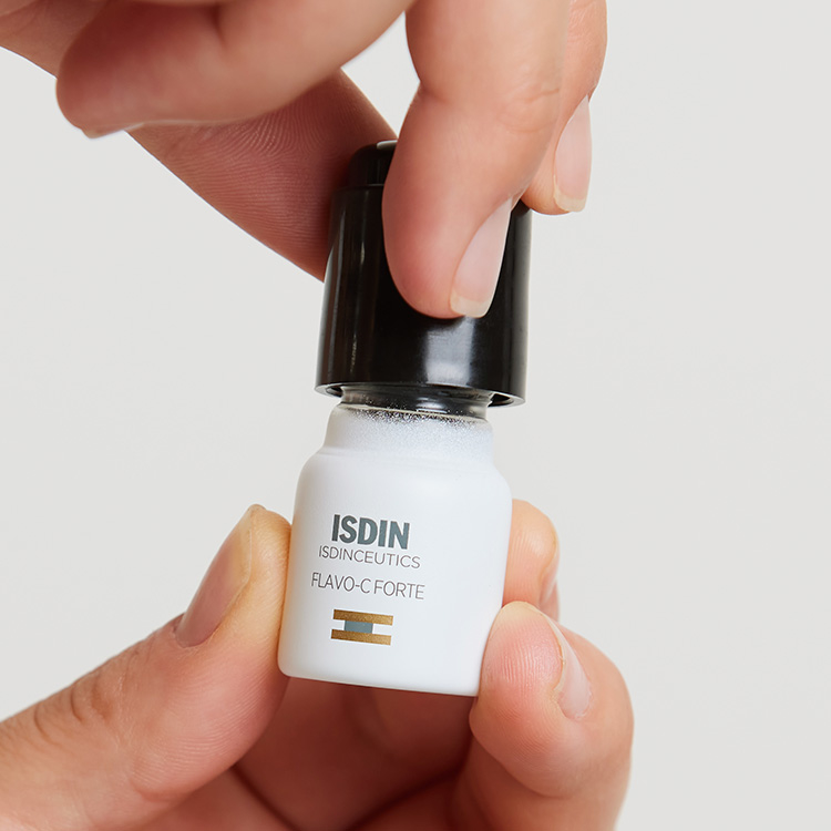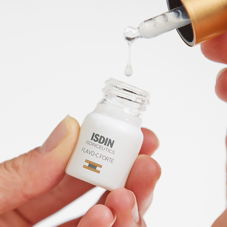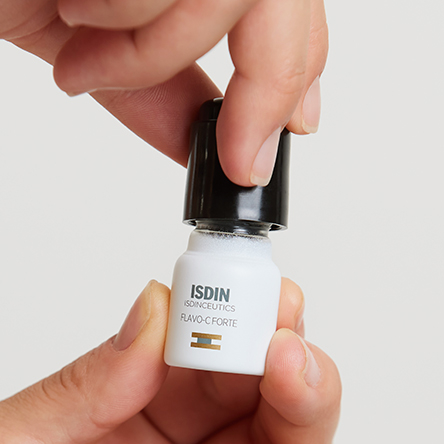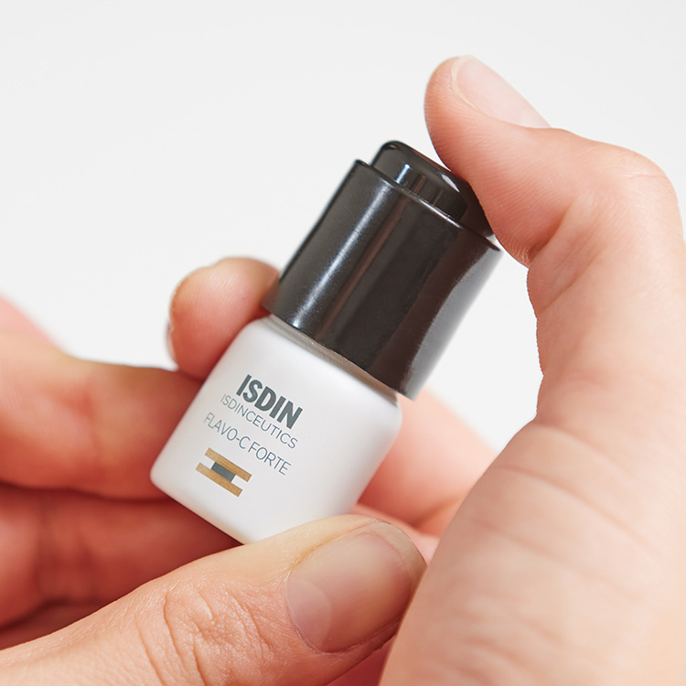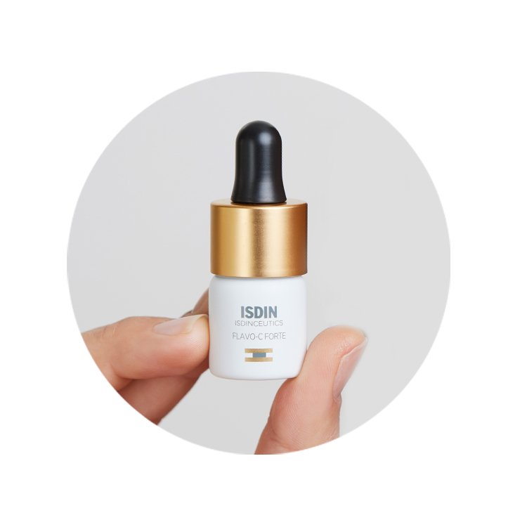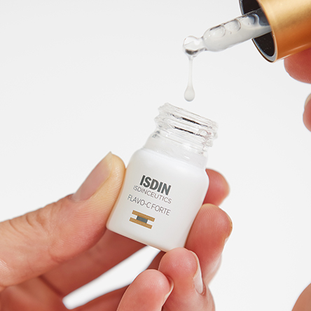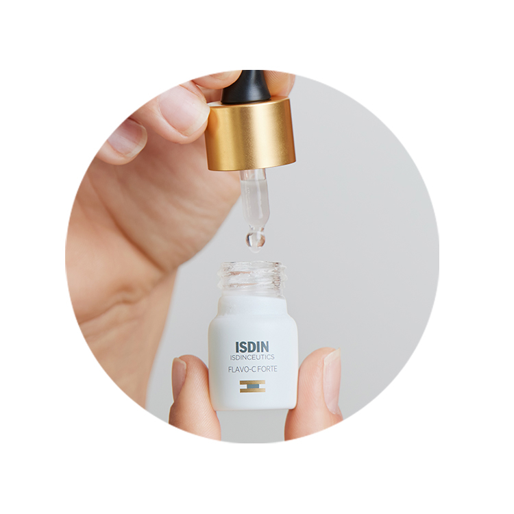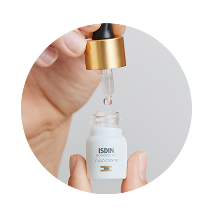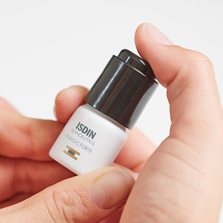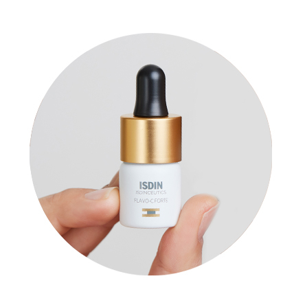 1. Study in human skin explants after stress produced by UV radiation, pollution and tobacco. ISDIN Data on file, 2021. * 155% increase in type I collagen in skin treated with Flavo-C Forte for five days vs. untreated skin 2. Study in human skin explants after stress produced by radiation with blue light (63.75 Jul / cm2). ISDIN Data on file, 2021. 3. Objective evaluation of hydration (Capacitance method) and skin barrier function (TEWL) in 24 subjects after a single application in an untreated area. ISDIN Data on file, 2021.